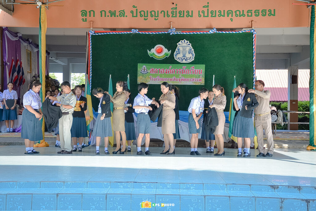 กิจกรรมหน้าเสาธง วันที่ 9 มิถุนายน 2568 ดร.จารุวรรณ รัตนมาลี ผู้อำนวยการโรงเรียนกาฬสินธุ์พิทยาสรรพ์ และคณะผู้บริหาร มอบช่อดอกไม้แสดงความยินดีให้สภาองค์การนักเรียน ประจำปีการศึกษา 2568 และมอบเกียรติบัตรให้กับสภาองค์การนักเรียน ประจำปีการศึกษา 2567