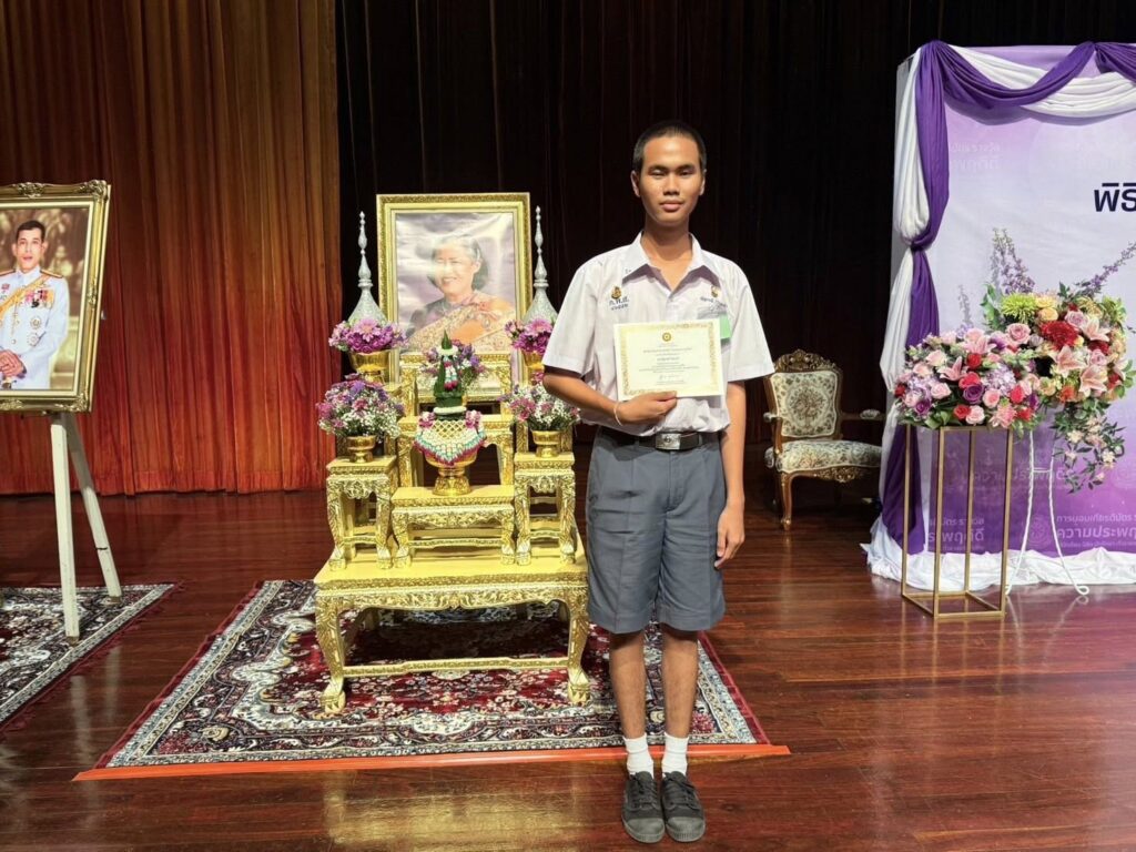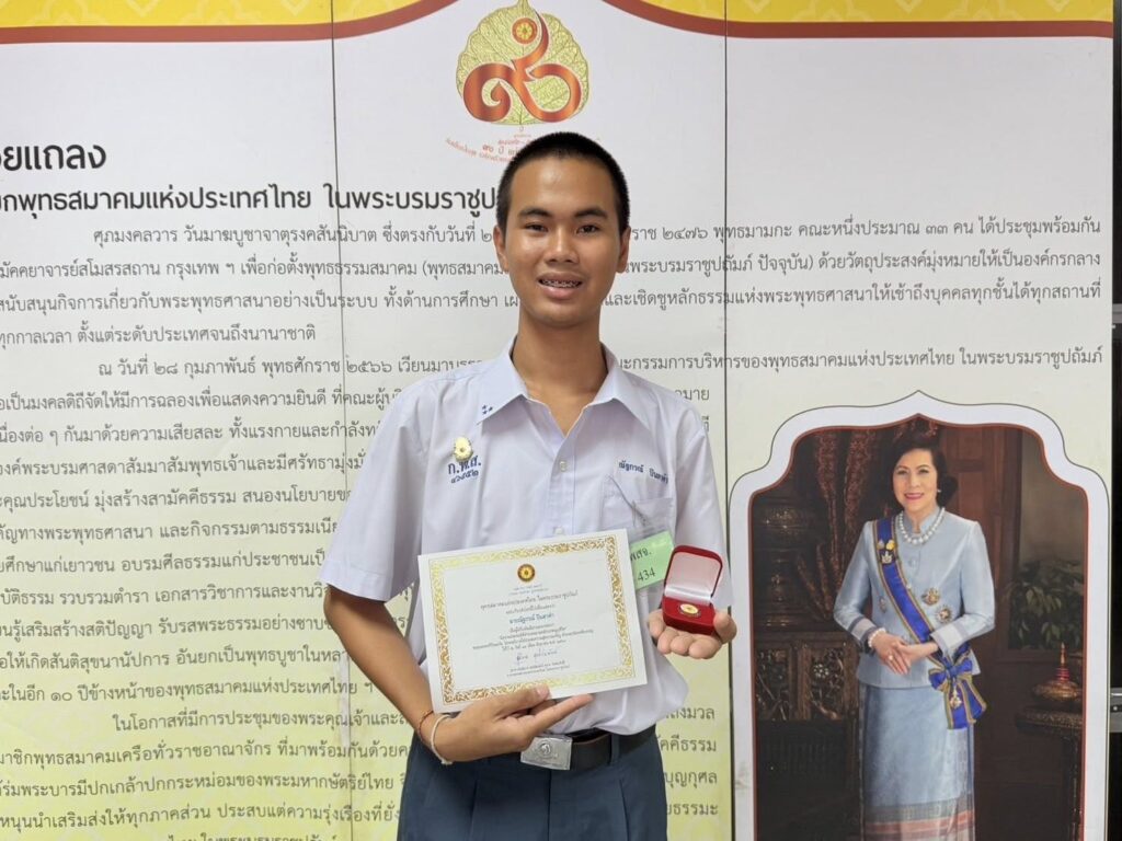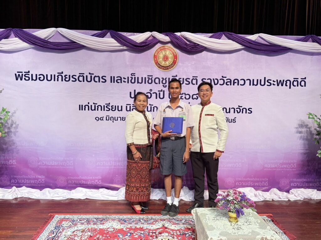 นายณัฐกรณ์ ปินตาคำ เข้ารับมอบเกียรติบัตร พร้อมเข็มเชิดชูเกียรติ ผู้ได้รับการคัดเลือก และยกย่องว่า “มีความประพฤติดีดำรงตนตามหลักธรรมนูญชีวิต”