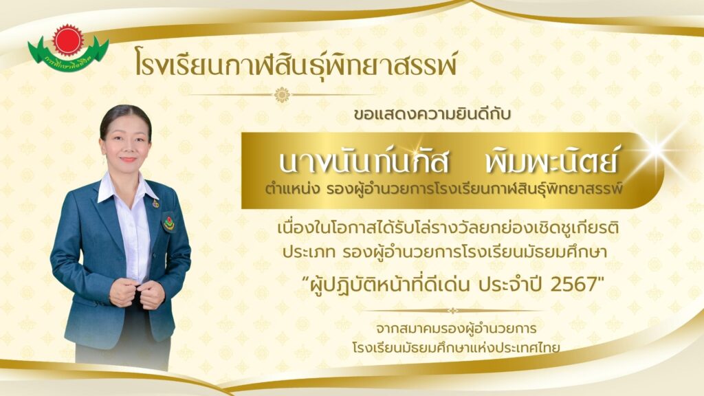 โรงเรียนกาฬสินธุ์พิทยาสรรพ์ ขอแสดงความยินดีกับ นางนันท์นภัส พิมพะนิตย์ รองผู้อำนวยการโรงเรียนกาฬสินธุ์พิทยาสรรพ์ เนื่องในโอกาสได้รับโล่รางวัลยกย่องเชิดชูเกียรติ ประเภท รองผู้อำนวยการโรงเรียนมัธยมศึกษา “ผู้ปฏิบัติหน้าที่ดีเด่น ประจำปี 2567″ จากสมาคมรองผู้อำนวยการโรงเรียนมัธยมศึกษาแห่งประเทศไทย