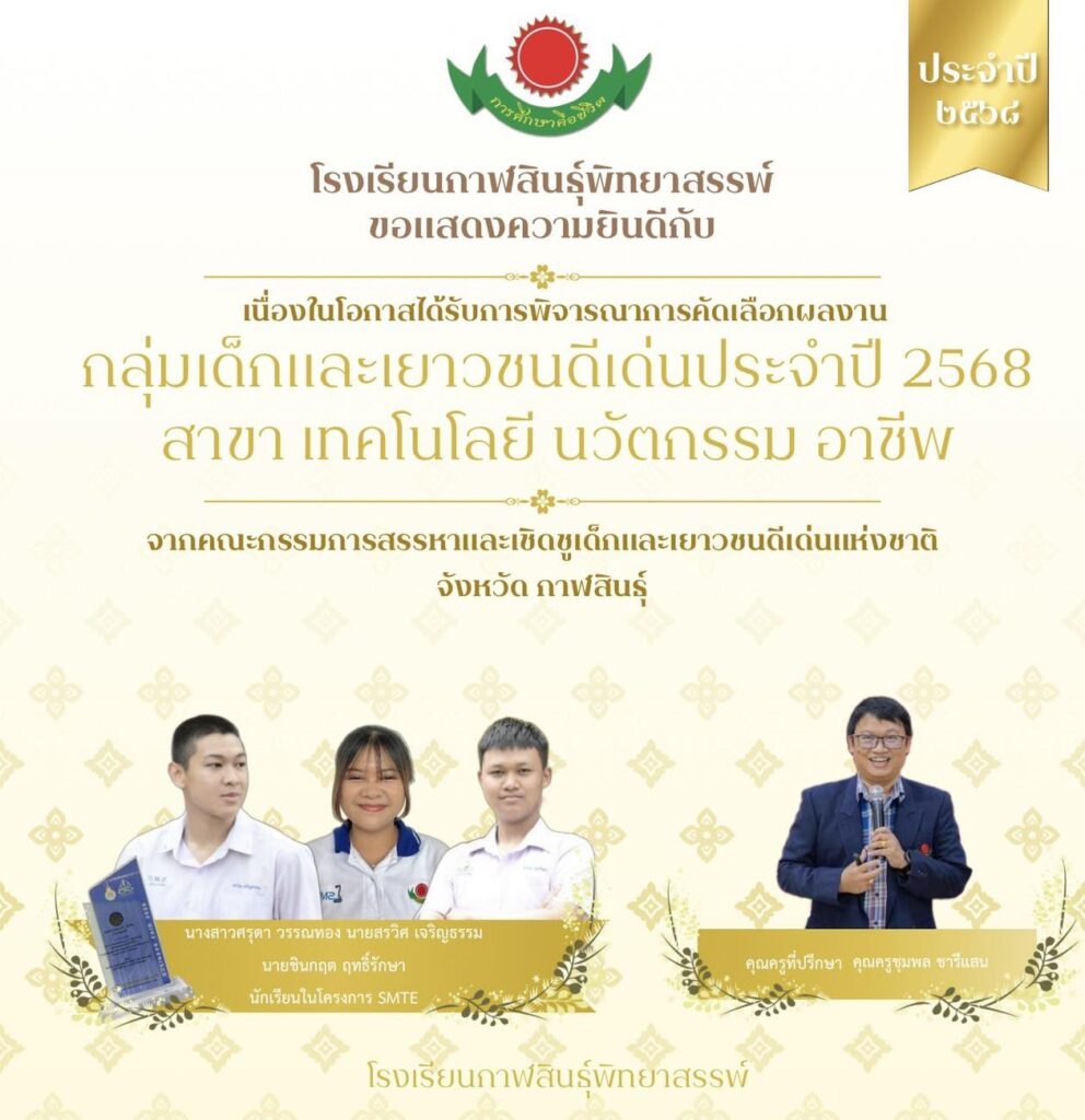โรงเรียนกาฬสินธุ์พิทยาสรรพ์ ขอแสดงความยินดีกับนักเรียนที่ได้รับคัดเลือกผลงานของเด็กและเยาวชนดีเด่นแห่งชาติ และผู้ทำคุณประโยชน์ต่อเด็กและเยาวชน จังหวัดกาฬสินธุ์ ประจำปี 2568 ประเภทกลุ่มเด็กและเยาวชนดีเด่น ลำดับที่ 1. กลุ่มนวัตกรรมเพื่อชุมชนกาฬสินธุ์ ด้านเทคโนโลยี นวัตกรรม อาชีพ ลำดับที่ 2 กลุ่ม Purerice ด้านเทคโนโลยีนวัตกรรม อาชีพ โดยจะได้รับการพิจารณาจากคณะกรรมการสรรหาและเชิดชูเด็กและเยาวชนดีเด่นแห่งชาติ และผู้ทำคุณประโยชน์ต่อเด็กและเยาวชน ประจำปี 2568 ต่อไป