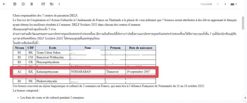 ผลคะแนนสอบวัดระดับทางภาษาฝรั่งเศส (DELF ระดับ A2) สูงสุดในภาคตะวันออกเฉียงเหนือ และทุนศึกษาต่อระยะสั้นแบบเต็มจำนวน ณ ประเทศฝรั่งเศส