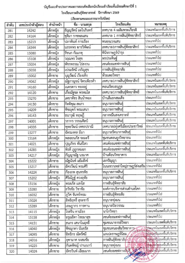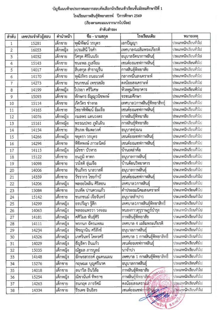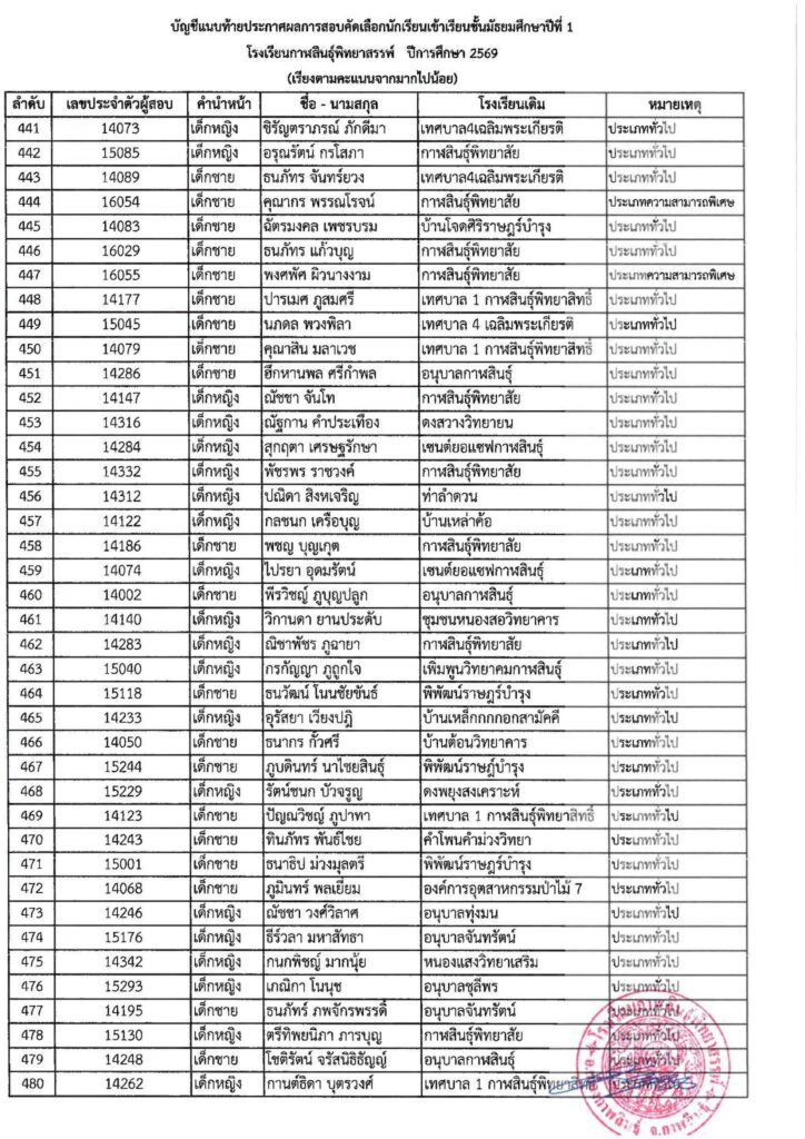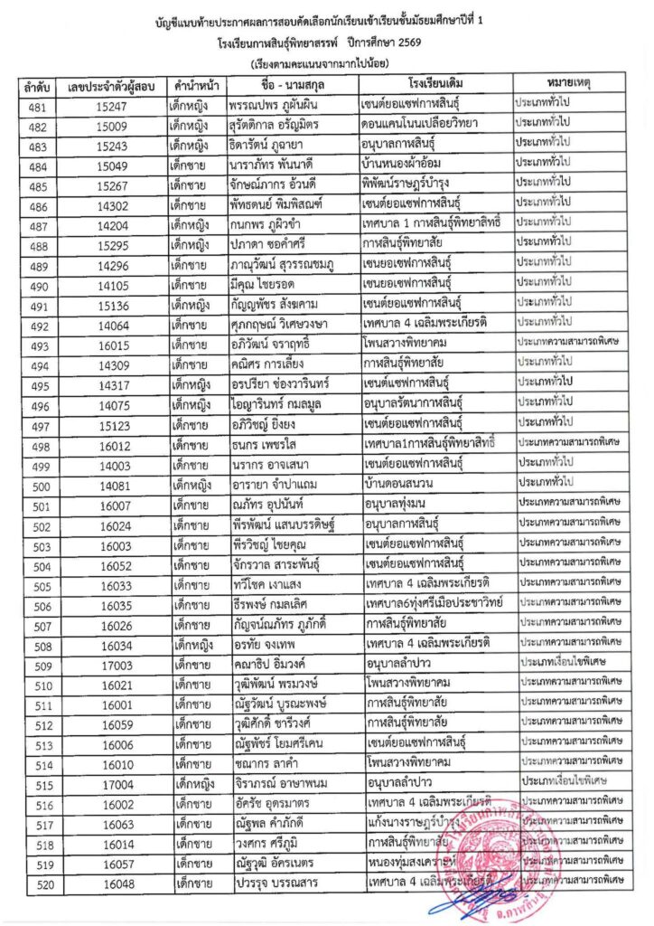 #ให้นักเรียนในลำดับที่ 1 – 520 (ตัวจริง) มอบตัวในวันที่ 4 เมษายน 2569 เวลา 08.30 – 16.30 น. ณ โรงเรียนกาฬสินธุ์พิทยาสรรพ์ #หากไม่มามอบตัวตามวันและเวลาที่กำหนดถือว่าสละสิทธิ์ ทางโรงเรียนจะดำเนินการเรียกตัวสำรองต่อไป