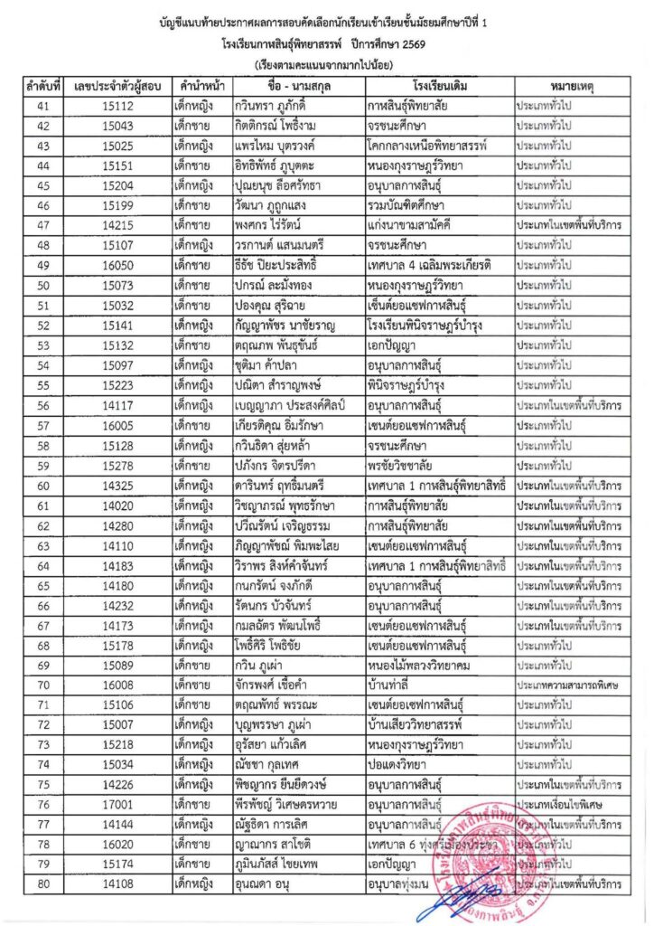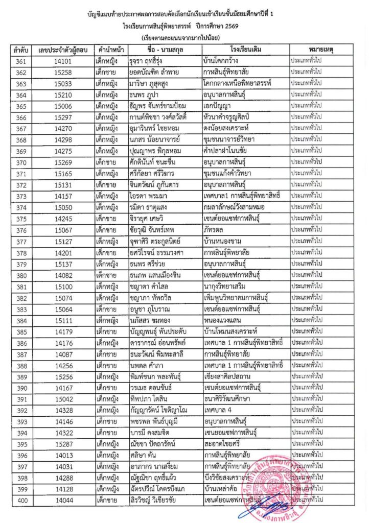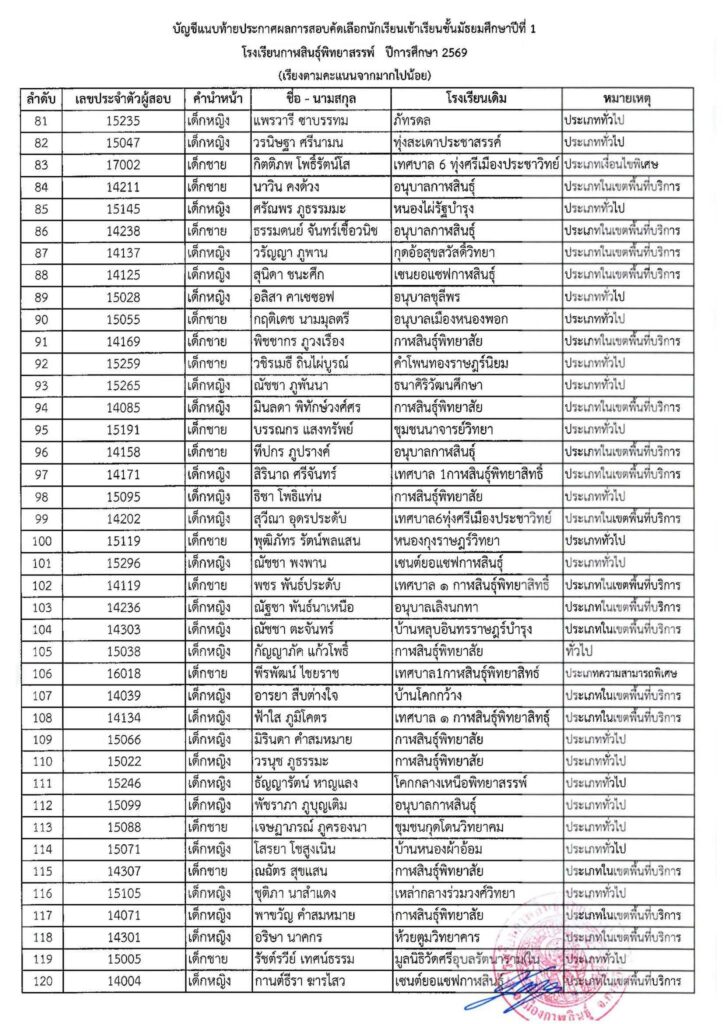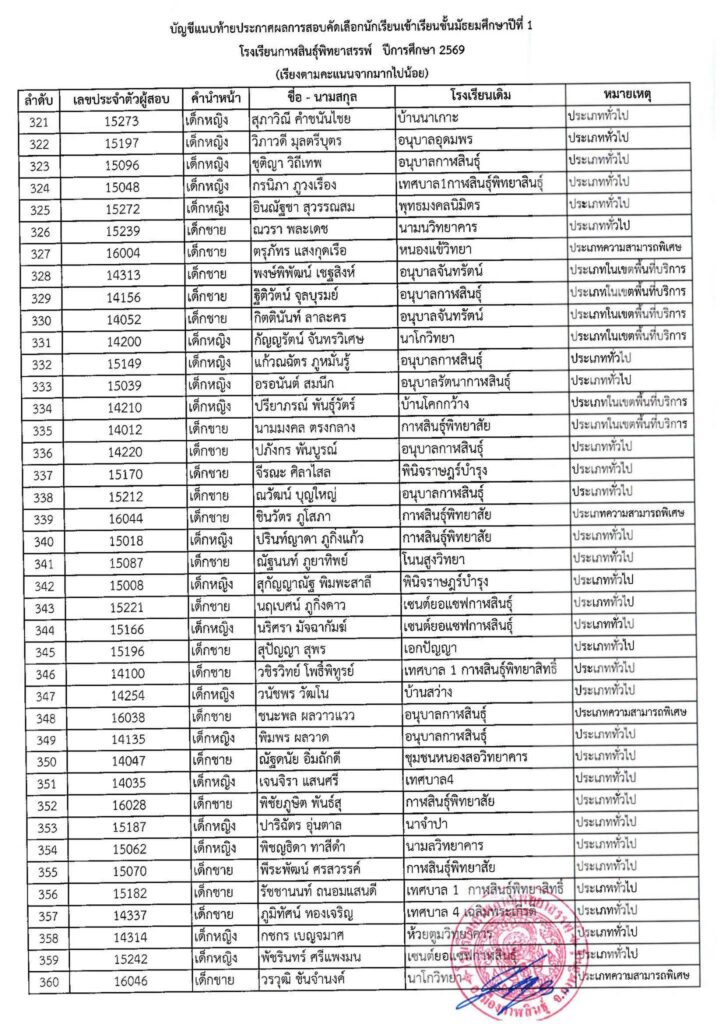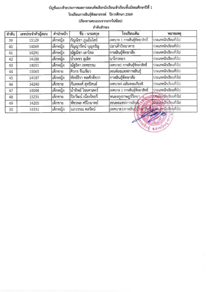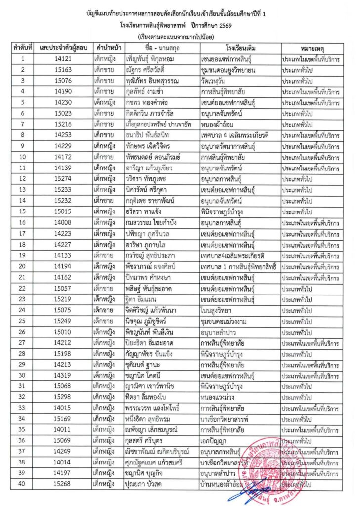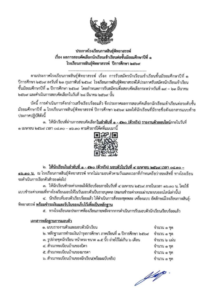 ประกาศโรงเรียนกาฬสินธุ์พิทยาสรรพ์ เรื่อง ผลการสอบคัดเลือกนักเรียนเข้าเรียนต่อชั้นมัธยมศึกษาปีที่ 1 ปีการศึกษา 2569